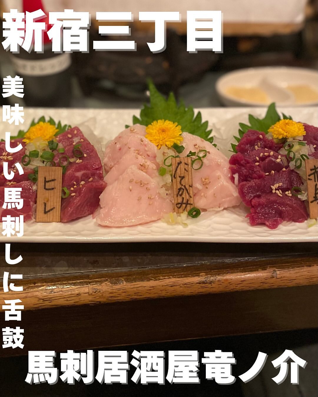 今日は、新宿三丁目にあるレトロな昭和の香りと秘密基地っぽさが味わえる、馬刺しが有名な馬刺居酒屋竜ノ介さんへ行って来ましたー😉💕